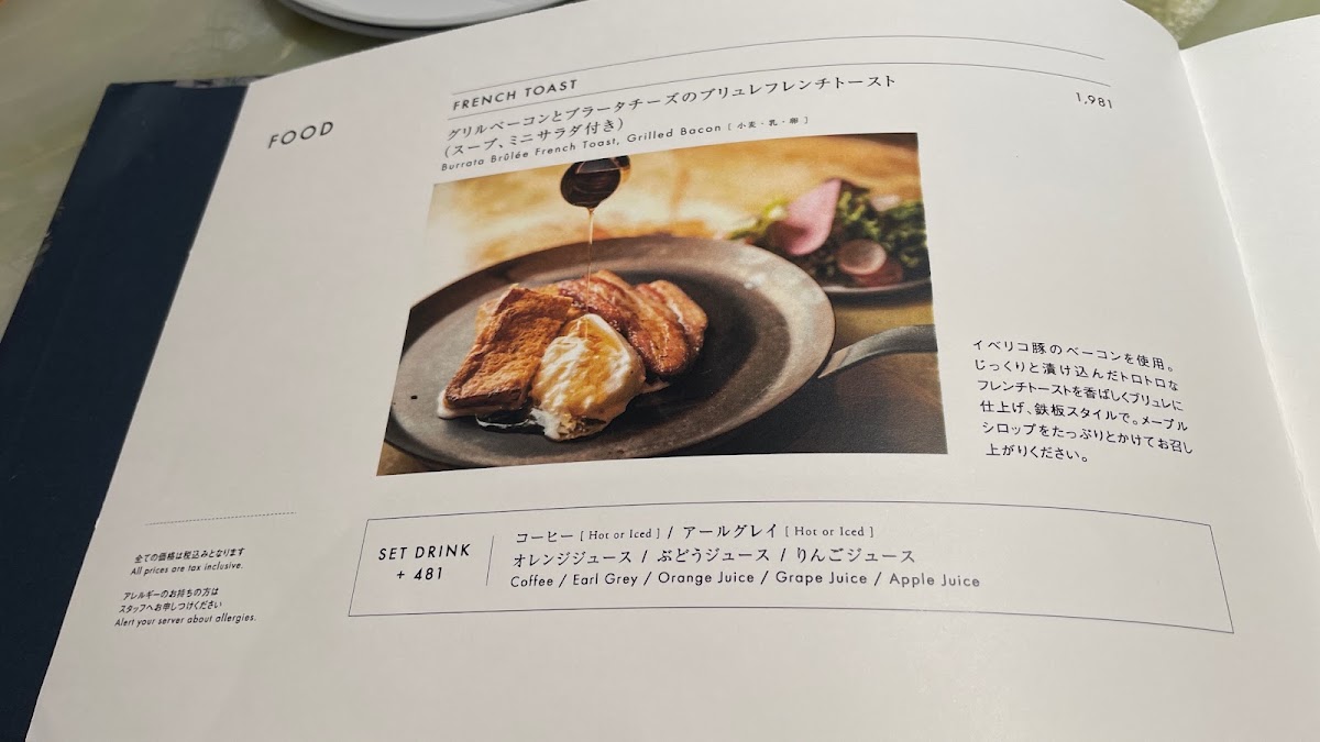 The cafe’s menu showcases a fusion of Japanese ingenuity and Western influences, inviting you to experience dishes that are not only delicious but also visually stunning. A must-try is the Grilled Bacon & Burrata Cheese Brulee French Toast (JP¥1,800), an exquisite delight that pairs crispy grilled bacon with the creamy richness of burrata cheese, all enveloped in a perfectly caramelized French toast. Complemented by a warm soup and a mini salad, it's a dish that promises to tantalize your taste buds.